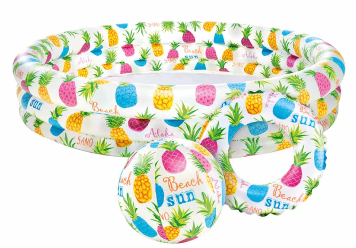 Set infantil de piscina, flotador y pelota hinchable piñas 51- 132×28 cm INTEX.